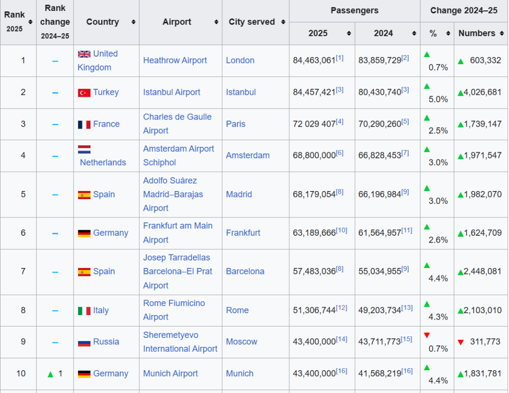 A Wikipedia, repülőterek éves beszámolóit összesítő adatai szerint, továbbra is az „örökös első” London-Heathrow (LHR) Európa legforgalmasabb repülőtere, ahol több, mint 84 millió utas fordult meg 2025-ben. A második helyen nagyon jön fel (IST), amely már csak pár ezer utassal marad el Londontól. A harmadik helyet továbbra is (CDG) foglalja el. A top 10 mezőnyében egyetlen változás, hogy a világon legnagyobb forgalmat bonyolító egypályás repülőtere, London-Gatwick (LGW) kiesett az első tízből, helyette Frankfurt (FRA) szerepel Európa tíz legforgalmasabb repülőtere között 2025-ben.